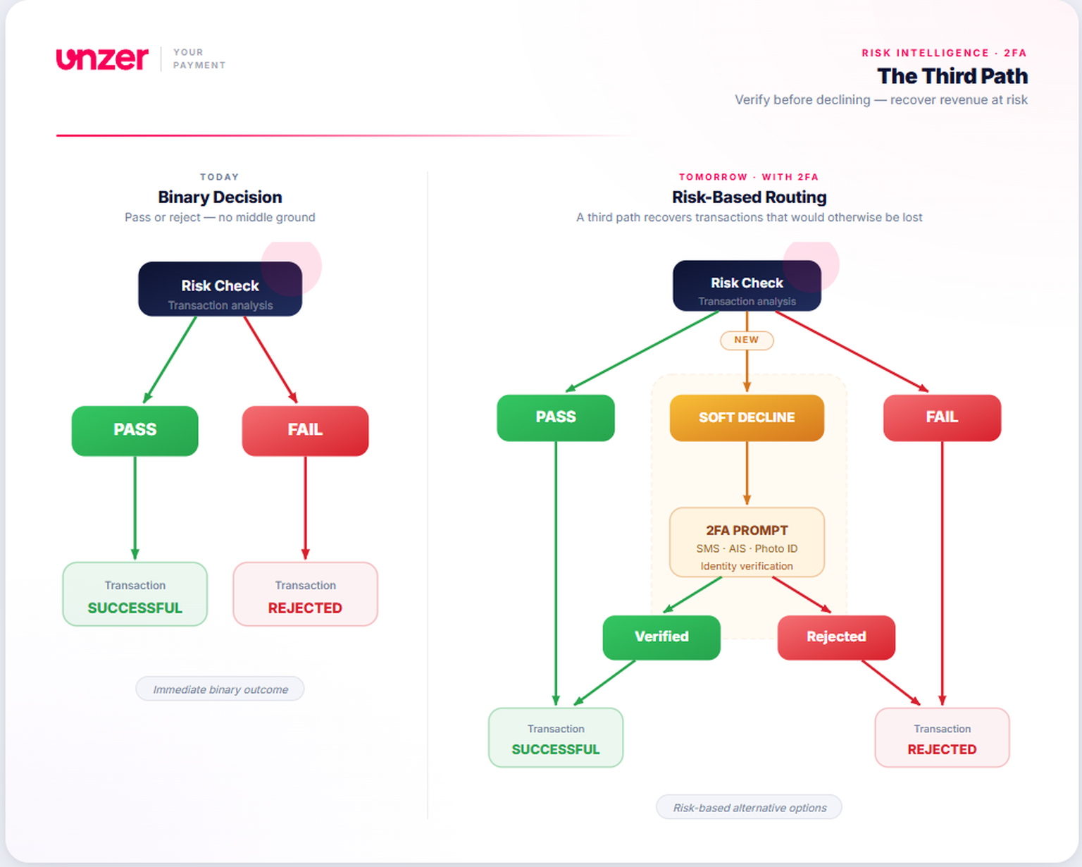 Unsere Risiko-Engine bewertet jede Transaktion. Das Ergebnis bestimmt den Weg: